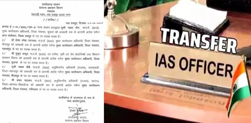 छत्तीसगढ़ सरकार ने आईएएस अधिकारियों का तबादला किया है। इसमें भारतीय प्रशासनिक सेवा के पांच अधिकारी प्रभावित हुए हैं। सुकमा जिला पंचायत की सीईओ नम्रत जैन को रायपुर का अपर कलेक्टर बनाया गया है।