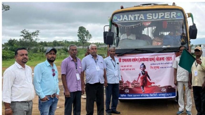 छत्तीसगढ़ शासन द्वारा प्रारंभ श्री रामलला दर्शन योजना के अंतर्गत मनेन्द्रगढ़-चिरमिरी-भरतपुर जिले से चयनित 57 श्रद्धालुओं में से 52 श्रद्धालुओं का दल आज प्रातः कलेक्टर कार्यालय परिसर मनेन्द्रगढ़ से अयोध्या धाम के लिए रवाना हुआ। यह दल अम्बिकापुर रेलवे स्टेशन से विशेष ट्रेन द्वारा श्रीरामलला के दर्शन के लिए पावन अयोध्या भूमि की यात्रा करेगा। राज्य शासन की इस महत्वपूर्ण योजना का उद्देश्य प्रदेश के श्रद्धालुओं को नि:शुल्क अयोध्या यात्रा का सौभाग्य प्रदान करना है। योजना के तहत श्रद्धालुओं को श्री राम जन्मभूमि मंदिर के दर्शन के साथ ही आवास, भोजन, सुरक्षा और चिकित्सकीय सुविधा सहित पूर्ण यात्रा पैकेज उपलब्ध कराया जा रहा है।