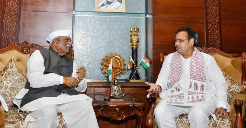 मुख्यमंत्री भजनलाल शर्मा ने सोमवार को राजभवन पहुंचकर राज्यपालहरिभाऊ बागडे से मुलाकात की। राज्यपाल बागडे से उन्होंने राजस्थान के विकास से जुड़े मुद्दों पर चर्चा की। राज्यपाल बागडे से मुख्यमंत्री शर्मा की यह शिष्टाचार भेंट थी।